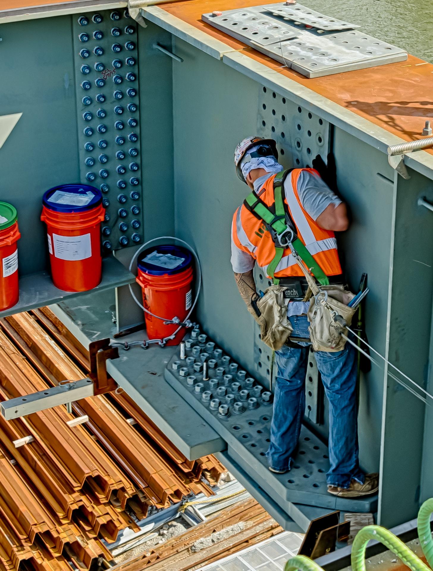 JNR_05_26_2015_092637_Tower_Five_01_HDR Posted on June 12, 2015July 30, 2015 by Nick Roberts Trey Dewitt Ironworker working on edge girder as a new section of the Downtown Span is lifted into place for the Ohio River Bridges Project in Louisville KY, HDR Version #2