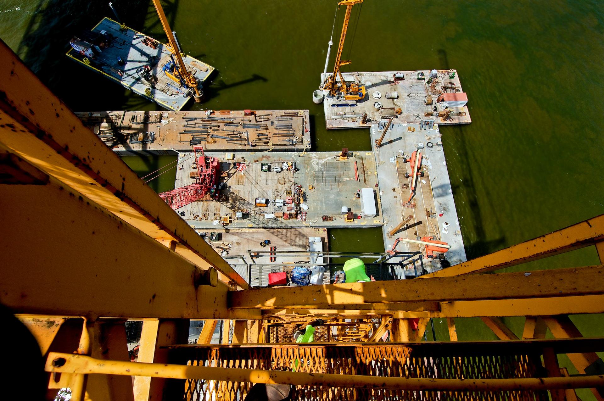 JNR_2014_08_15_35636_Downtown_CrossinORB_CS5-Version_Image 2014714-17-470815 Posted on August 28, 2014September 12, 2014 by Nick Roberts Work barges at base of the tower crane on Pier 5 of the downtown span of the Ohio River Bridges Project in Louisville, KY.